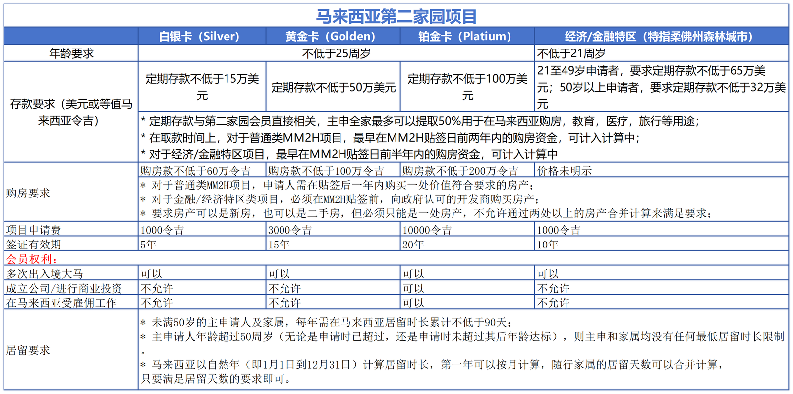 有关马来西亚第二家园项目不同选项的申请要求,会员权益及其它特殊点,我们制作了一张图片来呈现:
