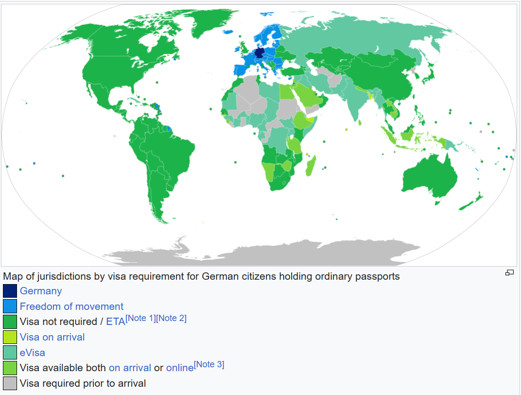 德国认可双重国籍,护照排行全球第四,护照持有者可自由通行(免签或落地签)世界上188个国家和地区(2025.11.2)。
