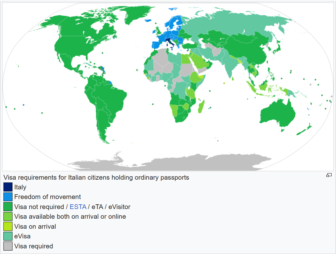 意大利不认可双重国籍(血统继承除外),护照排名全球第四位,持有者可自由通行(免签或落地签)世界上188个国家和地区(2025.10.28)。