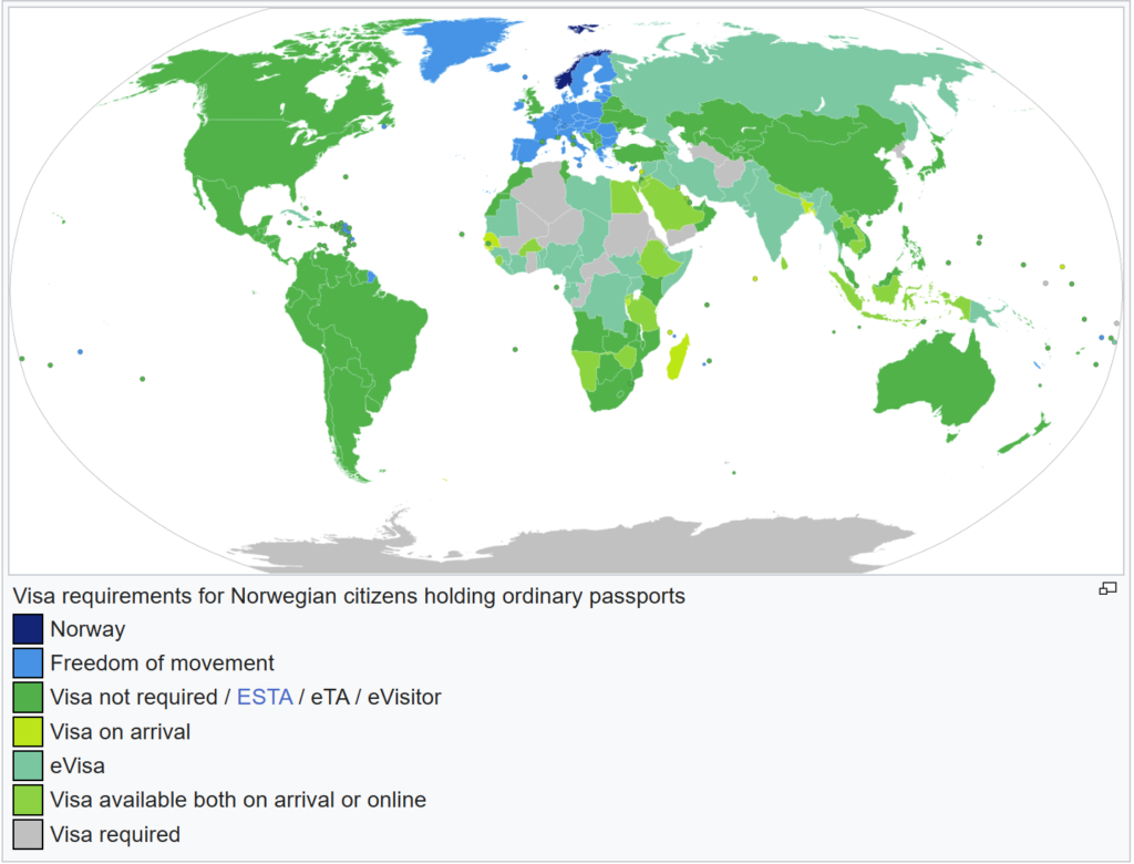 挪威认可双重国籍,护照排名全球第四位,公民可自由通行(免签或落地签)世界上188个国家和地区。(2025.7.10)