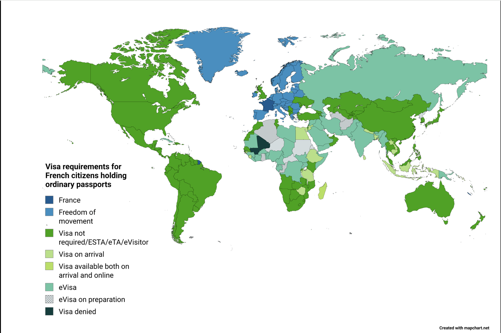 法国认可双重国籍,护照排名并列全球第二,持有者可自由通行(免签或落地签)世界上192个国家和地区。(2025.7.14)