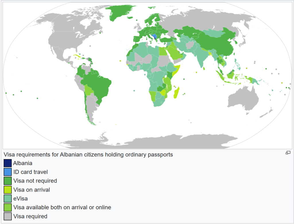 阿尔巴尼亚认可双重国籍,护照排名全球第43位,持有者可自由通行(免签或落地签)世界上127个国家和地区。(2025.7.21)